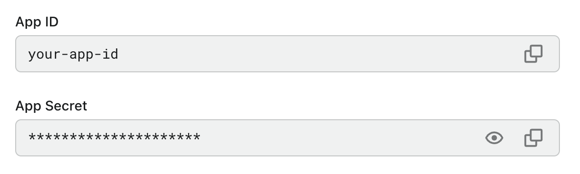 이는 요청의 Authorization 헤더에 Basic 인증 (Authentication) 형식으로 애플리케이션의 자격 증명을 포함하여 달성할 수 있습니다: {App ID}:{App Secret}를 base64로 인코딩한 후, Basic 접두사 뒤에 값을 설정합니다.