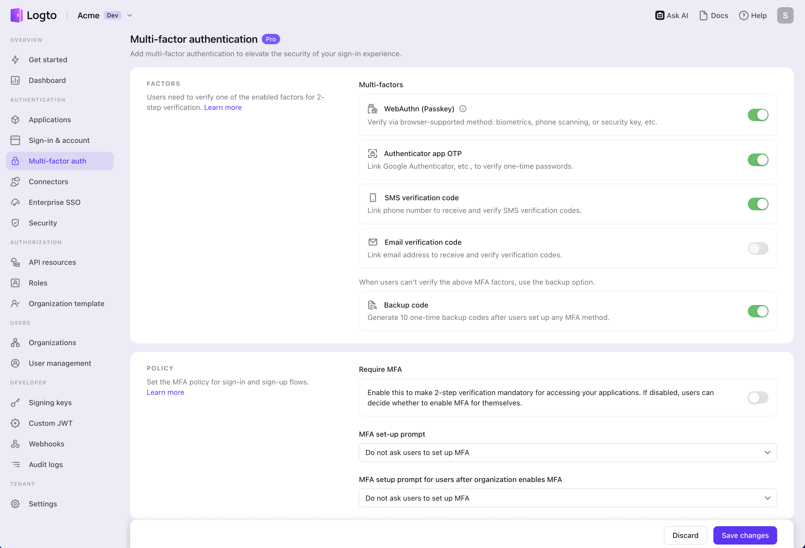 O Logto oferece opções flexíveis de configuração de MFA para atender a diferentes requisitos de segurança. Você pode configurar o MFA em nível global para todos os usuários ou habilitá-lo por organização para aplicativos multi-inquilino.